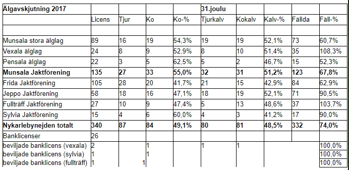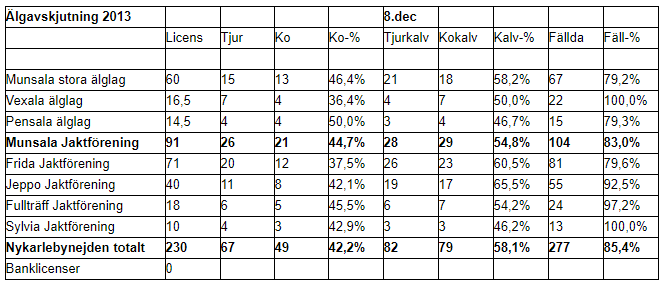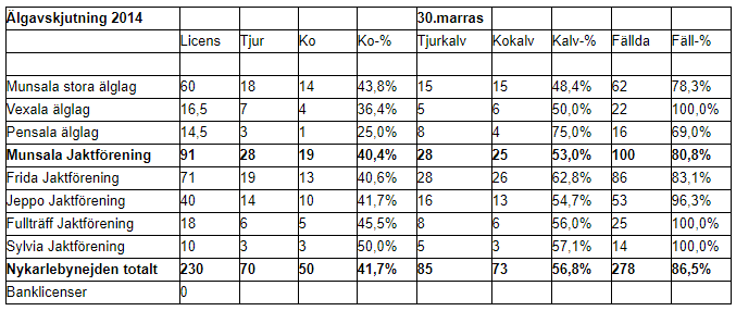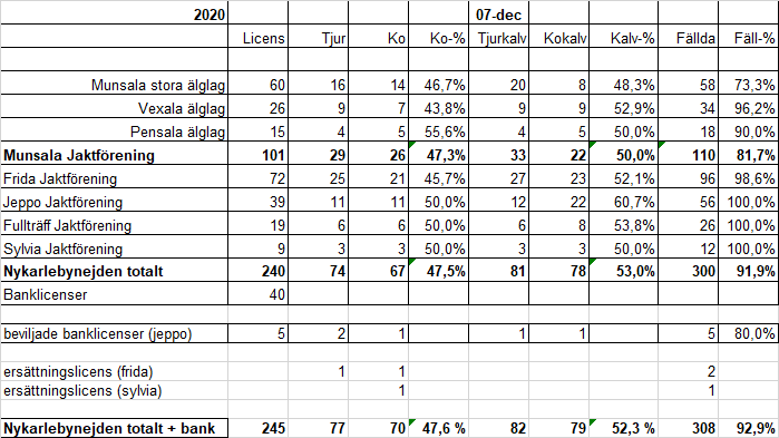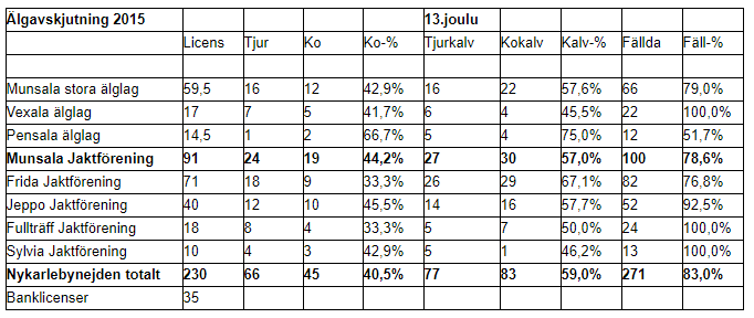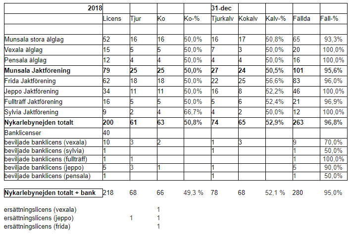 | Licens fällda 218st | 78,4% | Tjur 58% | Kalv 46% | ||||||||||
