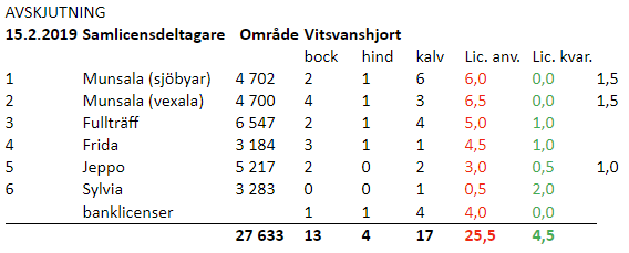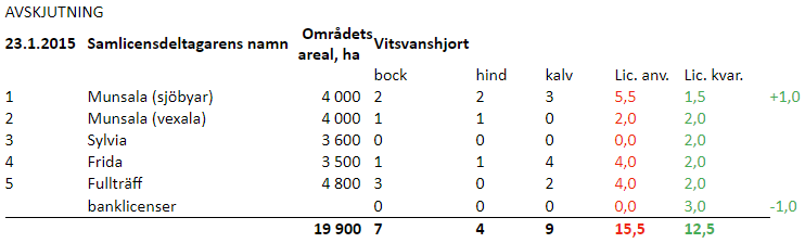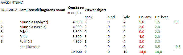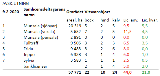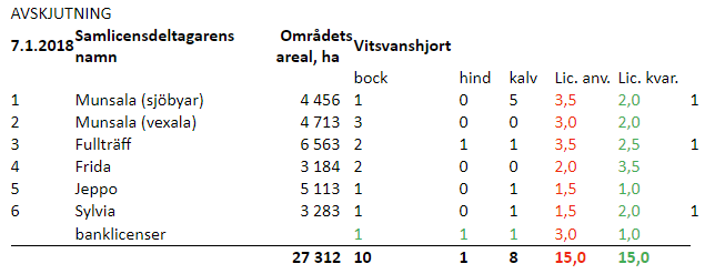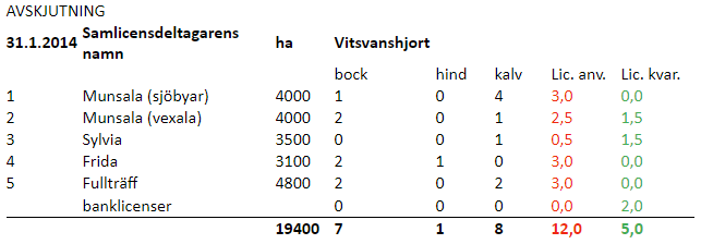 | areal, ha | bock | hind | kalv | Lic. anv. | Lic. kvar. | ||